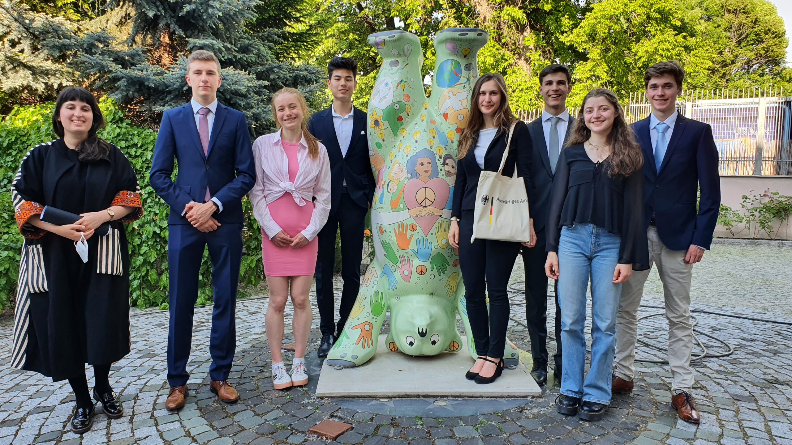 Das erste internationale MEP in Präsenz seit 2019…. und wir waren dabei. In meiner MEP Laufbahn konnte ich leider nur zwei MEPs in Präsenz mitnehmen, welche darüber hinaus beide sehr lange her waren, weswegen die Vorfreude auf das iMEP in Rumäniens Hauptstadt Bukarest umso größer war. Das Gefühl mit über 200 EuropäerInnen Abend zu essen, konnte nur am nächsten Tag von der Ausschussarbeit übertroffen werden. Mit 13 hochmotivierten Jugendlichen in einem Raum zu sitzen, zu debattieren und das Länderschild zu heben…. all das habe ich vermisst und es war besser, als ich es mir jemals hätte vorstellen können. Vor allem für die Delegierten, welche noch kein MEP vor der Corona Pandemie erleben konnten war die Erfahrung einmalig. Reden halten und dabei nicht nur in ein Mikro sprechen und einen Bildschirm ansehen, sondern die Gesichter von über 200 Politik interessierten europäischen Jugendlichen zu sehen – Dieses Gefühl ist unbeschreiblich. (Und auch ein Besuch bei der deutschen Botschaft in Bukarest passte da ist Bild -siehe Foto)