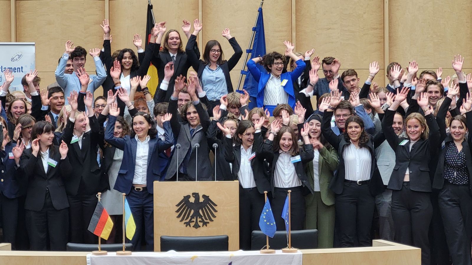 Anschließend wurden in Ausschüssen sieben aktuelle europapolitische Themen diskutiert und die Ergebnisse in Resolutionen festgehalten. Diese wurden dann zwei Tage lang in der Plenardebatte im Bundesrat diskutiert und jeweils am Ende einer Diskussion wurde über die Resolutionen abgestimmt. Die Delegation aus Wadern beteiligte sich rege an den Debatten und trug auch mit vielen Reden zur Belebung der Plenardebatte bei. So hielt Tim Haupert eine Gegenrede gegen die Resolution des Ausschusses für Biodiversität, Rosalie Morbe kritisierte in ihrer Rede die Positionen des Ausschusses für Energie, für den zuvor Florian Vogt einen Änderungsantrag begründet hatte, und Cilli Thieser warb in einer Einleitungsrede für die Resolution des Ausschusses für Auswärtige Angelegenheiten. Katharina Dewald aus Wadern beantwortete für ihren Ausschuss Verständnisfragen des Plenums zur Resolution über die mentale Gesundheit Jugendlicher. Auch Ann-Sophie Seiwert beteiligte sich aktiv an der Debatte über die Resolution des Auswärtigen Ausschusses, der von Amelie Reinert und Kevin Zimmer aus Wadern geleitet worden war.
