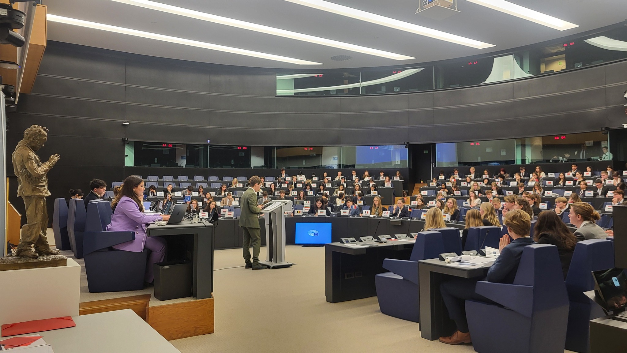 Bereits die feierliche Eröffnung im Regionalrat Grand Est war für viele Teilnehmende ein unvergesslicher Moment. Die Parlamentsdebatte stand unter der Schirmherrschaft der Präsidentin des Europäischen Parlaments, Roberta Metsola. Hochrangige Gäste wie der Kehler Bürgermeister Wolfram Britz und der Ortenauer Landrat Thorsten Erny stellten sich den Fragen der Jugendlichen. Zudem diskutierten die Europaabgeordneten Vivian Costanzo (Offenburg) und Fabienne Keller (Straßburg) im Fraktionssaal der S&D-Fraktion mit den Delegierten. Hier standen wir unter der ständigen europäischen Beobachtung des Geistes des ehemaligen Bundeskanzlers und Friedensnobelpreisträgers Willi Brandt. Weitere Experten, darunter Udo Bux (Verbindungsbüro des Europäischen Parlaments in München), Volker Schebesta (Staatssekretär im Kultusministerium Baden-Württemberg) und Axel Müller (Europa-Zentrum Stuttgart), begleiteten die Diskussionen in den zehn thematischen Ausschüssen.