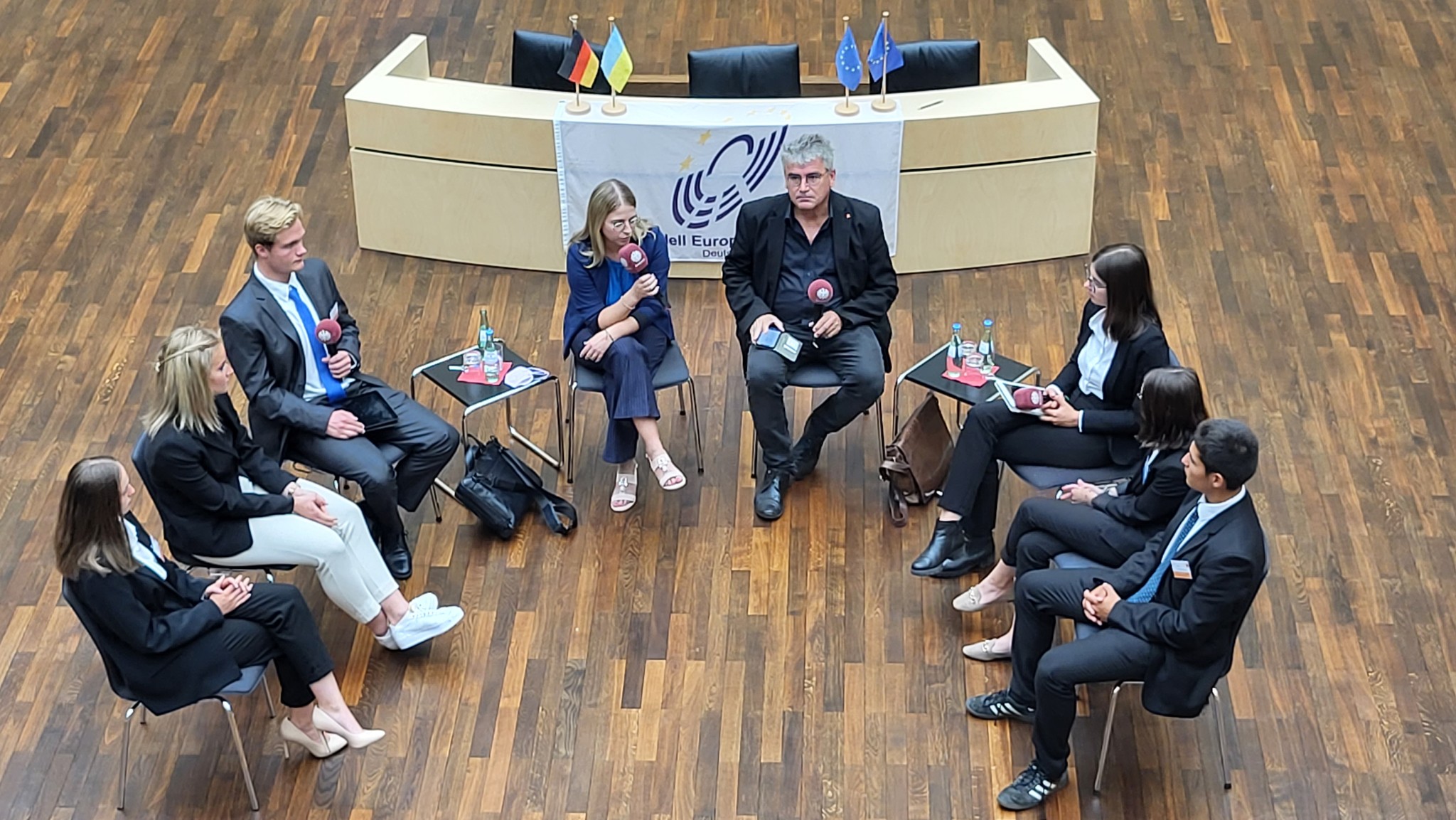 Zur diesjährigen Fishbowl-Diskussion hatten wir zwei Abgeordnete aus dem Europaausschuss des Deutschen Bundestages eingeladen. Beide, sowohl Chantal Kopf (Bündns90/Grüne) als auch Christian Petry (SPD) sind Sprecher:in Ihrer Fraktion für europapolitische Fragen. Chantal Kopf ist dabei erst vor einem Jahr in den Bundestag gewählt worden, Christian Petry ist bereits seit 2014 mit dabei. Beide gehören zur Regierungskoalition, und so war auch wenig Streit zwischen ihnen zu erwarten. Darum ging es uns auch nicht. Es ging um Information, Diskussion und vor allem um die zahlreichen Fragen der Jugendlichen. Diese drehten sich um die Krisenherde in der Welt: Ukrainekrieg, Energiepreise, Atomkraft, Nachhaltigkeit, Beitrittsperspektiven für die Türkei, Radikalisierung der Parteienlandschaft.